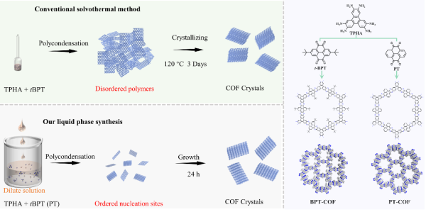 近平衡液相法與傳統(tǒng)溶劑熱法制備二維有機(jī)框架材料的對(duì)比。左上圖為傳統(tǒng)溶劑熱法,需要高溫、高壓、封管等苛刻條件,聚合后通過長(zhǎng)時(shí)間晶化,形成框架材料;左下圖為近平衡液相生長(zhǎng)法,在稀溶液、開放體系中直接成核、生長(zhǎng),形成框架材料,室溫下制備,條件相對(duì)溫和;右圖為本工作制備BPT-COF和PT-COF兩種二維有機(jī)框架材料的示意圖