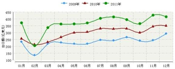 圖5-2  2009~2011中國輕工全行業連續三年出口額月度走勢對比圖