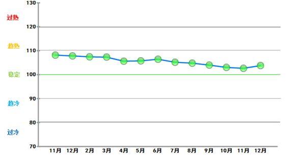 12月份中輕景氣指數為103.81,位于“穩定”區域,體現了當前我國輕工業整體發展較為平穩的狀態(參見圖1-1)。與11月相比,中輕景氣指數回升1.15。