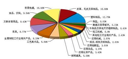 2011年,塑料制品,皮革、毛皮及其制品,家用電器仍為出口額較大的行業,分別占到全部出口額的的12.75%、10.86%和10.46%。從同比增速來看,工藝美術品,制鹽,紙漿、紙張及紙制品三個行業的出口額增速較快。
