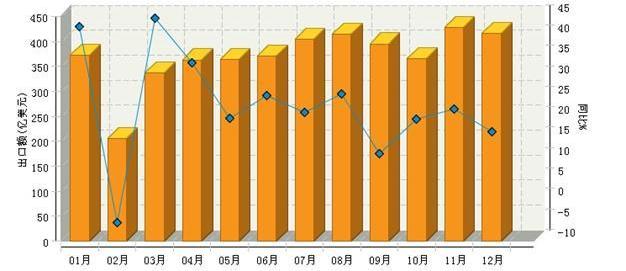 2011年1~12月,全國輕工全行業累計完成出口額4,431.14億美元,同比增長22.95%。其中12月份完成出口額415.41億美元,同比增長16.83%。