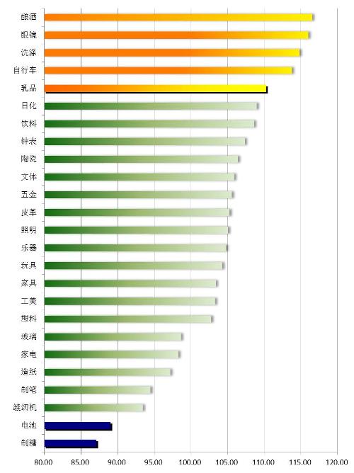 從分行業運行指數來看,在重點監測的25個行業中,有9個行業景氣指數下降,其中制糖行業景氣指數下降明顯。16個行業景氣指數上升,眼鏡、陶瓷行業上升明顯。其中釀酒、眼鏡、洗滌、自行車、乳品五個行業仍然處于趨熱區間,電池行業和制糖行業處于趨冷區間。