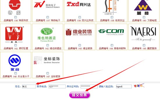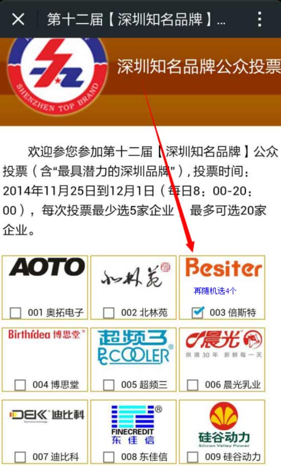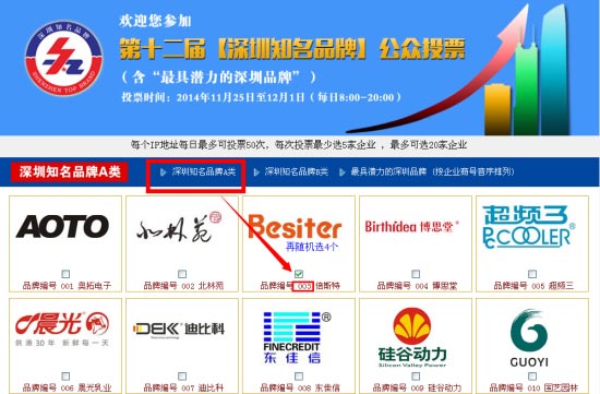 1、投票時需要輸入投票人姓名,身份證號碼,聯系電話,并點擊選中的品牌編號(003-深圳市倍斯特電源有限公司)對應的投票欄;A類。