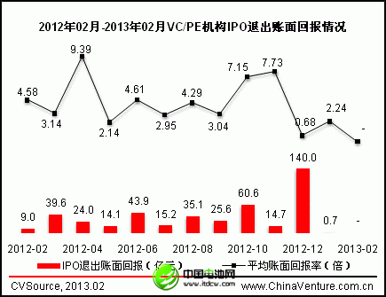 圖4 2012年02月-2013年02月VC/PE機構IPO退出賬面回報情況