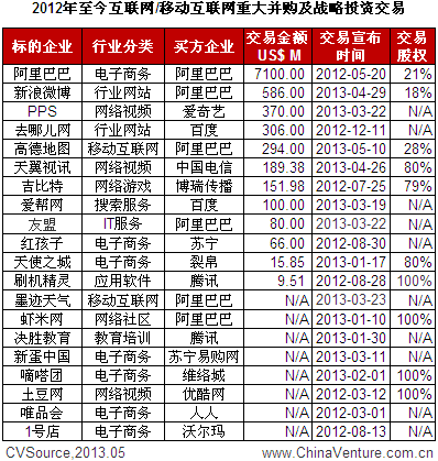 2013年初至今,與幾近跌至冰點的IPO市場相比,并購市場頻繁傳出重大交易,互聯網行業表現尤為突出,行業巨頭紛紛展開多元化布局:3月22日,百度通過旗下視頻公司愛奇藝以3.7億美元收購全國最大的網絡電視服務商PPS;3月23日,阿里巴巴收購手機客戶端天氣服務公司墨跡天氣;4月29日,阿里巴巴以5.86億美元收購新浪微博18%股份; 5月10日,手機地圖服務商高德地圖確認獲得阿里巴巴集團2.94億美元投資(見表1)。