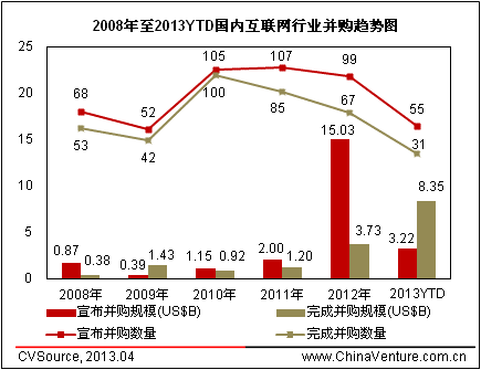 圖1 2008年至2013YTD國內互聯網行業并購趨勢圖