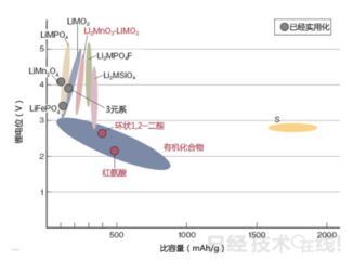從圖1可以看到,理論能量密度比OLO更高的正極材料還有很多,如Li2MPO4F、LiMSiO4、有機化合物等,特別是有機化合物,理論容量最大可達到近1,000mAh/g。而且不使用重金屬。因此具備重量輕,資源限制少的優勢。不過,有機化合物正極材料的理論能量密度雖然很高,但是鋰電位卻比較低,大多只有2~3.5V。因此,要想實現與目前的鋰離子電池相同的能量密度,至少要找到具備400~600mAh/g容量的有機化合物。目前也有很多日本企業在這方面努力,其中就包括松下、本田、村田制作所(Murata,電子零件專業制造商,已深入鋰電領域)等知名企業。