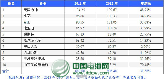 2012年中國鋰離子電池電芯企業前10強(以產銷量計) 單位:萬kWh