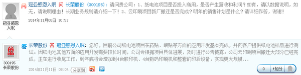 長榮股份表示,目前公司紙電池項目在藥貼、眼貼等方面的應(yīng)用開發(fā)基本完成,并向客戶提供紙電池樣品進行測試。