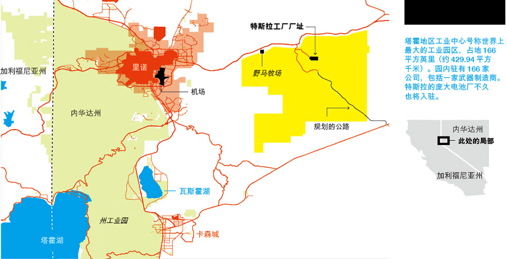 對于吉爾曼管理的這片區域,“工業園區”并不算是很合適的叫法,他對外宣傳它是世界上最大的工業園區。它位于只有4,000名居民的斯托里縣(Storey County),更像是一個面積166平方英里(約429.94平方千米)的獨立公國,自己制定規則,擁有166家租戶。根據早在2000年簽下的全面協議,這里的土地幾乎可以用來做你能想象到的一切事情。比如為美國軍隊制造武器的租戶美國軍械公司(U.S. Ordnance)就在園區內有一個5,000英畝(約2,023.43公頃)的射擊場,用于測試火炮。縣政府(吉爾曼是三位當選的專員之一)承諾在不到30天內就提供建筑許可證。為了加快建設,縣官員還會在凌晨兩點視察水泥澆灌的進度。
