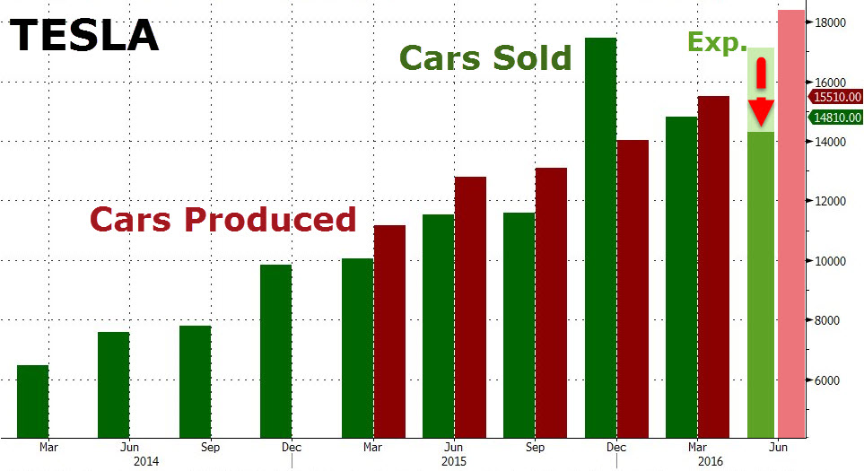 如金融博客Zerohedge下圖所示,二季度特斯拉不但出貨量與預(yù)期相差很大,比預(yù)期少出貨約15%,而且該司史上首次出現(xiàn)出貨量環(huán)比下滑。