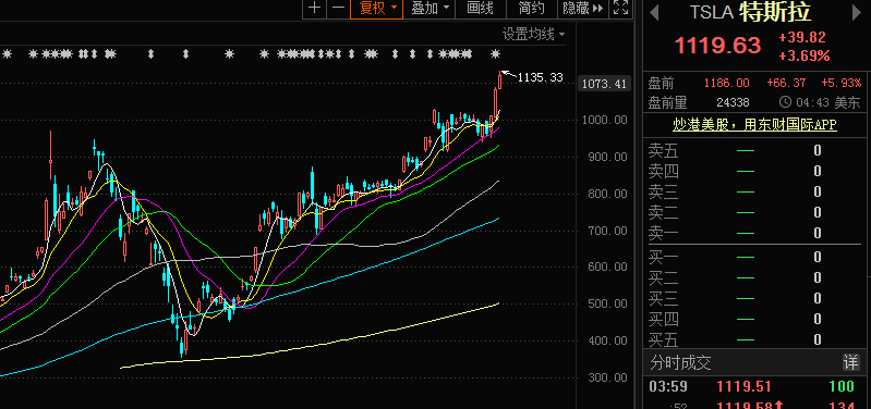 自6月29日以來,特斯拉股價連漲三日,盤中一度沖高至1135.33美元,截至發稿暫報1119.63美元,漲幅達 ... 查閱全文