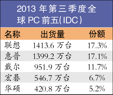 據Gartner數據顯示,2006年第三季度惠普PC銷售量首次超越戴爾,成為全球PC業老大,此后則連續6年占據龍頭地位。而在最近一個季度,聯想仍是全球第一大PC商,出貨同比增長2.8%,達1420萬臺,市場份額達17.6%,上年同期份額為15.7%。惠普排名第二,占有全球市場17.1%的份額,出貨1370萬臺,上年同期份額15.4%。