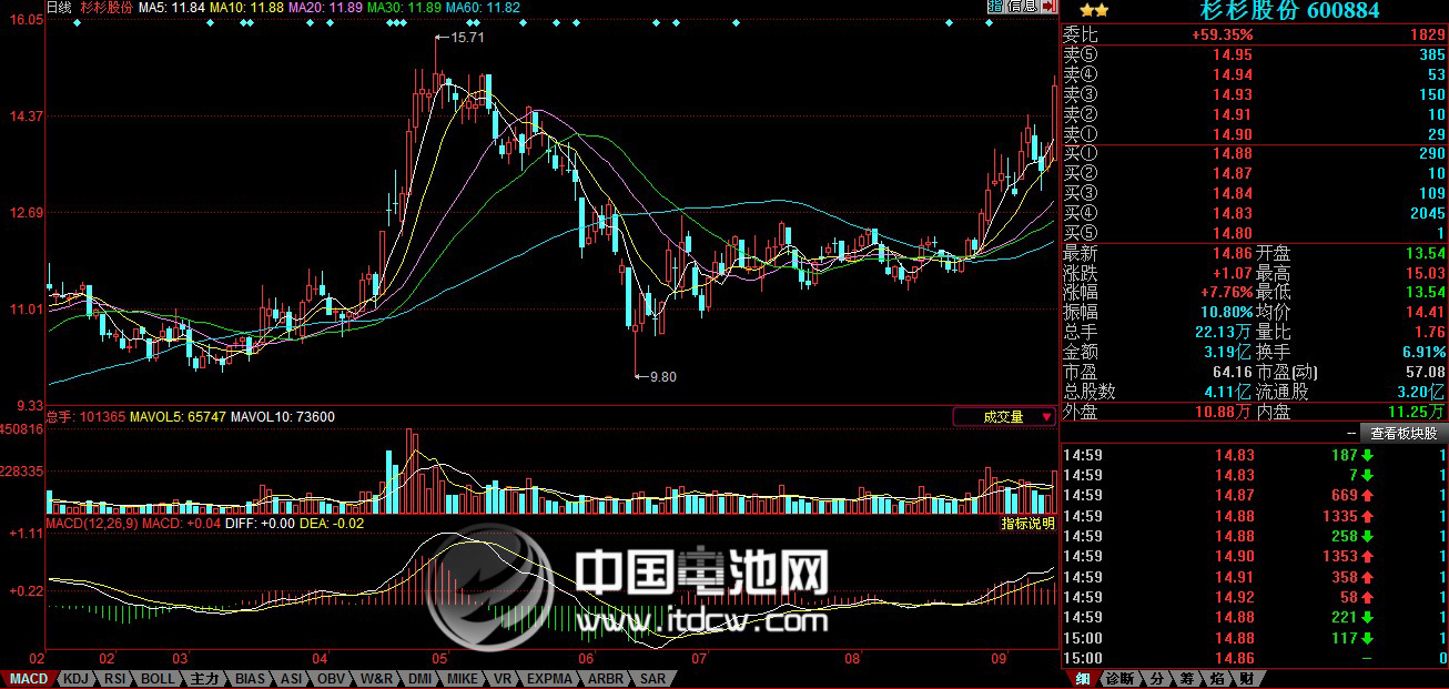 中國電池雜志-中國電池網9月24日訊(肖何 北京報道) 受新能源汽車補貼新政、特斯拉創新高等利好因素影響,前期回調休整的鋰電池概念股今日再度放量上攻,尾盤收盤德賽電池(000049)大漲8.18%,收盤價為61.63元,杉杉股份(600884)大漲7.76%,午后一度將觸及漲停,尾盤收在14.86元。成飛集成(002190)、佛塑股份(000973)漲幅超過2%,電動自行車概念澳柯瑪(600336) 漲幅為6%。