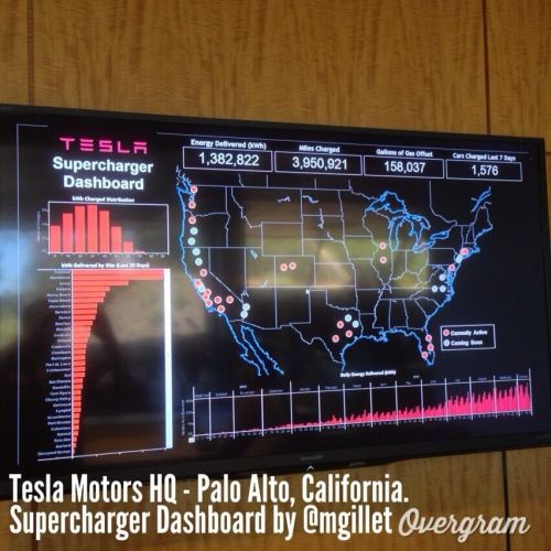 特斯拉汽車公司總部設(shè)有一塊超級(jí)充電站顯示屏,通過網(wǎng)絡(luò)實(shí)時(shí)獲取并反饋美國(guó)全境Model S電動(dòng)汽車的充電狀況。