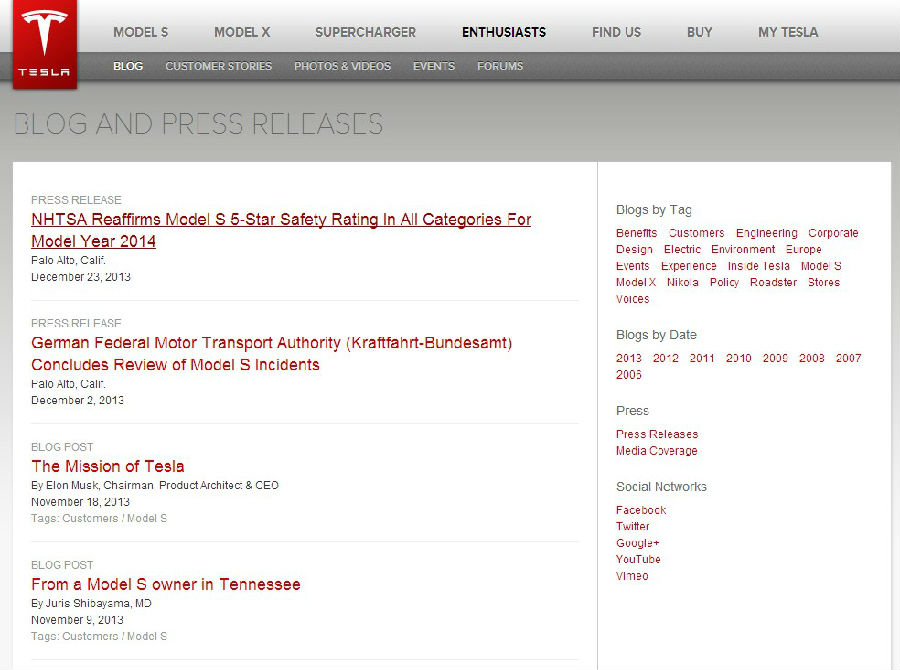 大家有空可去翻看特斯拉的官網,會看到他們的博客從還名不見經傳的2006年,堅持寫到了現在,馬斯克本人在寫(如第三篇“The Mission of Tesla”),另外還有很多的一線的管理者,也會積極參與進來。