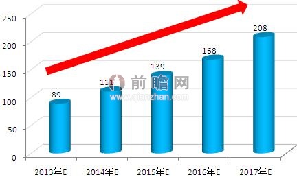 圖表:2013-2017年中國鋰電池正極材料市場規(guī)模預(yù)測(單位:億元)