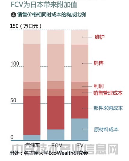 右表是汽油車、FCV、EV的售價在150萬日元時的成本構成比例。尤其值得一提的是,F(xiàn)CV的價格中,依賴進口的“原材料費用”這一項所占比重較少,而大多在日本采購的“部件采購費用”所占比例與汽油車一樣多。