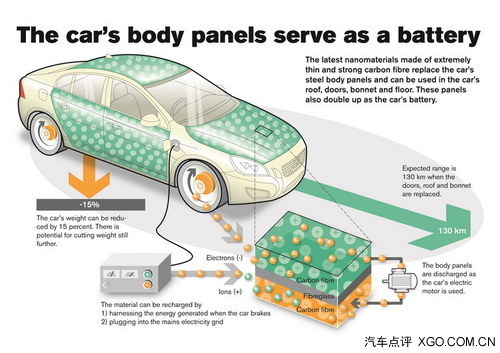由于采用這樣的電池生產(chǎn)技術(shù)之后,可將電池制成車(chē)門(mén)板、發(fā)動(dòng)機(jī)蓋、車(chē)頂,甚至輪圈蓋的樣式。可有效節(jié)省車(chē)輛的空間,電池組可透過(guò)充電器或是汽車(chē)剎車(chē)(能量回收系統(tǒng))為其充電,由于采用全新材料制成的電池,其充電速度要比傳統(tǒng)電池組快很多。此外由于采用碳纖維材料打造的電池外殼,其特點(diǎn)在于堅(jiān)固并附有彈性,即使在車(chē)輛發(fā)生碰撞時(shí)也不會(huì)導(dǎo)致電池組被破壞。