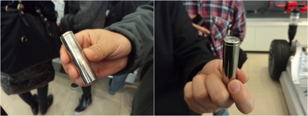 在展示區的底盤旁,特斯拉服務負責人辛誠給我們展示了傳說中的18650鋰電池,7000多節這樣與普通電池大小無異的電池組被放在了底盤上方,有密集恐懼癥的讀者請謹慎腦補畫面。