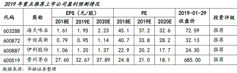 在2019年經濟增速放緩預期下,華融證券看好食品飲料這一防御性板塊的投資機會。自上而下看,建議選擇弱周期性的板塊,如調味品和乳制品;自下而上看,建議選擇護城河較寬、業績穩定、具有提價能力及品牌稀缺性等特征的標的。建議關注海天味業(603288.SH)、中炬高新(600872.SH)、伊利股份(600887.SH)、貴州茅臺(600519.SH)。