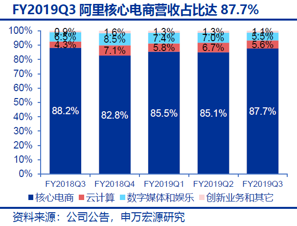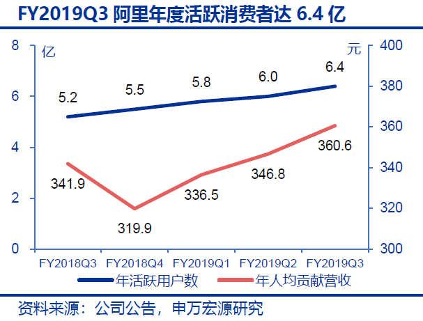 阿里日前公布2019財年第三季度財報,實現營收1172.8億元,同比增長41.3%,其中核心電商業務營收1028.4億元,同比增長40.4%,占營收比重87.7%;實現凈利潤309.6億元,同比增長32.7%,增速環比提升27.9個百分點。國內零售平臺月度活躍用戶達到6.99億,環比凈增加3300萬,截至2018年12月31日止的12個月,年度活躍消費者達6.36億,同比增加3500萬,其中超過70%新增年度活躍消費者來自低線城市。