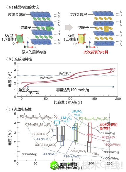 僅以鐵構(gòu)成的NaFeO2一般采用鈉和氧形成八面體網(wǎng)格的O3型積層構(gòu)造,以3.5V以上電壓充電時(shí),隨著鐵離子的移動(dòng)會(huì)發(fā)生不可逆相變。而P2型Na2/3(Fe1/2Mn1/2)O2即使充電電壓超過(guò)3.5V,也可以根據(jù)鐵的氧化還原反應(yīng)獲得可逆容量,充電電壓提高至4.5V時(shí)仍能維持層狀構(gòu)造。