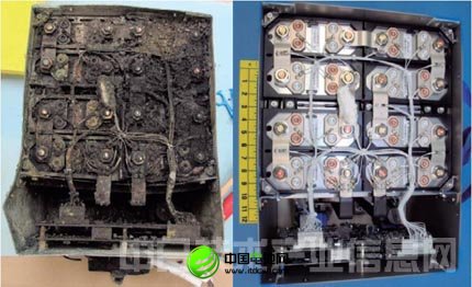 左為從發(fā)生起火事故的日航客機中取出的電池模塊。右為正常狀態(tài)。