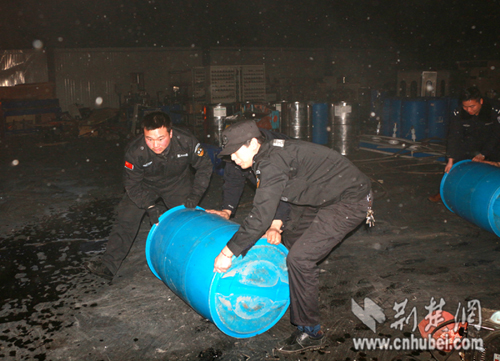 澴城派出所值班民警和聯勤隊員在全力轉運塑料桶裝的易燃物。通訊員 宋俊初 攝