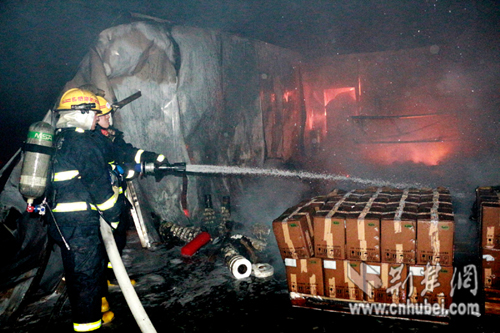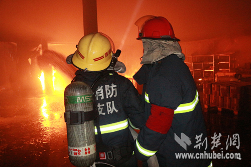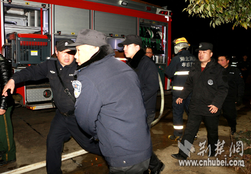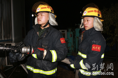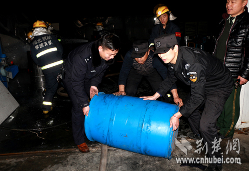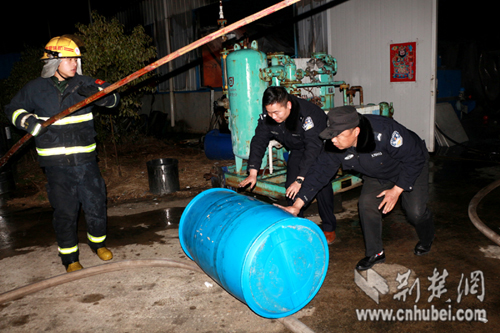 接到報警后,孝昌消防大隊立即出動了3臺水罐車和15名消防隊員趕到現場;孝昌縣澴城派出所值班民警岳星,也帶領8名聯勤隊員趕到了現場。到達現場后,當孝昌消防大隊大隊長錢光輝,了解到該廠倉庫中,堆放著一百多個塑料桶裝的易燃物后,立即指揮消防隊員從廠房西側和東側各出2支水槍,全力阻止火勢蔓延;一邊指揮民警和特勤隊員,轉移倉庫中堆放的塑料桶裝可燃物;隨后,撥打了孝感市消防支隊和相關部門的電話,請求援助。