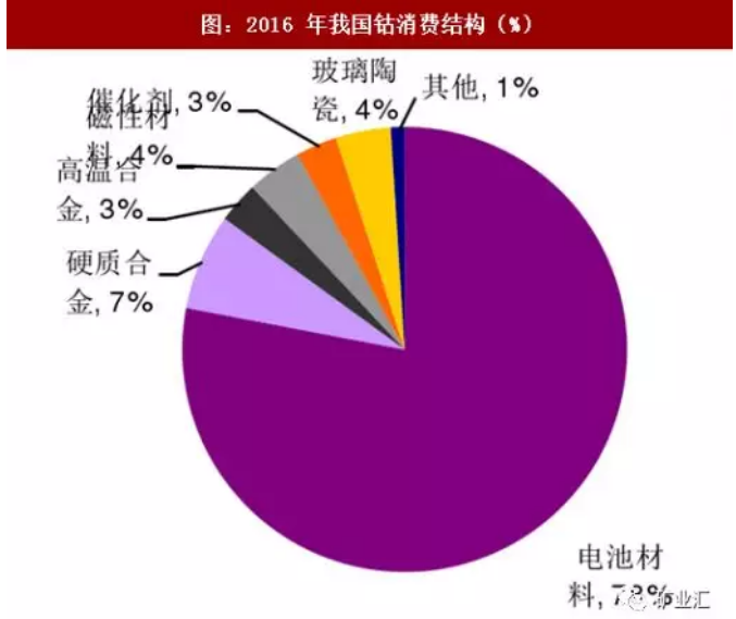 2016年中國鈷消費量達到4.6萬噸,同比增長6.9%。其中,電池在中國鈷的消費領域中占比由2006年的45%上升為目前的78%。