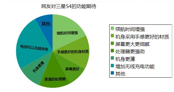 在屏幕效果方面,目前網友對現在的手機產品已經比較滿意,希望S4提升屏幕效果的比例只有9%,是所有選項中最低的一項。這說明網友在看待手機新產品時,已經趨于理性,目前主流的智能手機屏幕的精細程度均已達到了300PPI以上,遠超人類視網膜所能夠分辨的極限,在這種情況下,盲目的增加手機屏幕的分辨率只能減少電池使用時間,增加對硬件的消耗,得不償失。