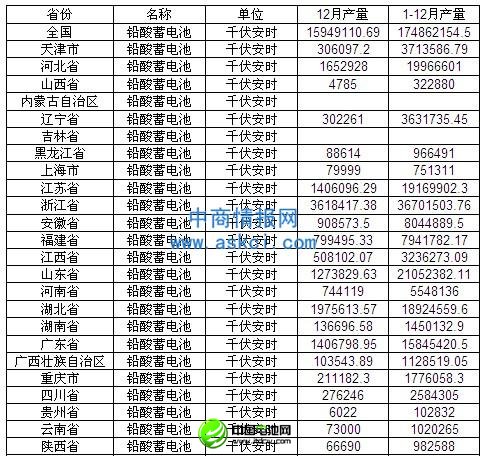 2012年1-12月中國鉛酸蓄電池產量為174862154.5千伏安時。