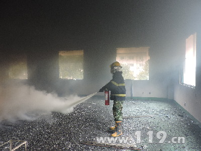 中隊指揮員立即與單位負責人協商,調來大量干粉滅火器進行撲救;同時利用黃沙覆蓋在電池表面,進行滅火處置。生產車間內充滿煙霧,溫度較高,現場分成三個小組進行快速撲滅火勢,經過大約1個半小時左右的救援,明火被撲滅。由于現場溫度過高,一層又有許多貴重設備,為確保妥當,消防隊員在現場留守,確保沒有險情發生。