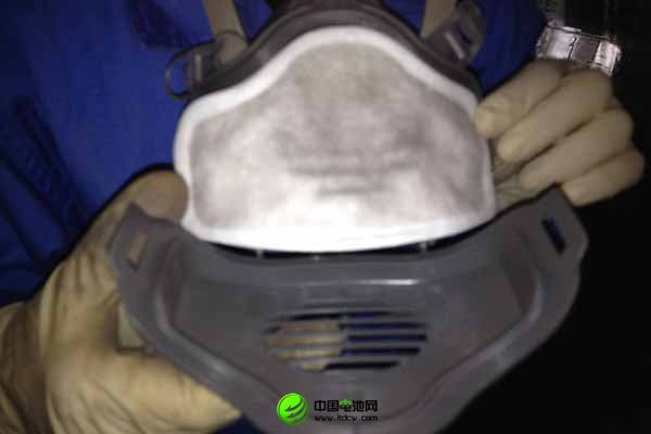 一位正在作業的工人將他戴著的口罩取下后,記者發現口罩內積存著大量的黑色含鉛粉塵。 劉曉星攝