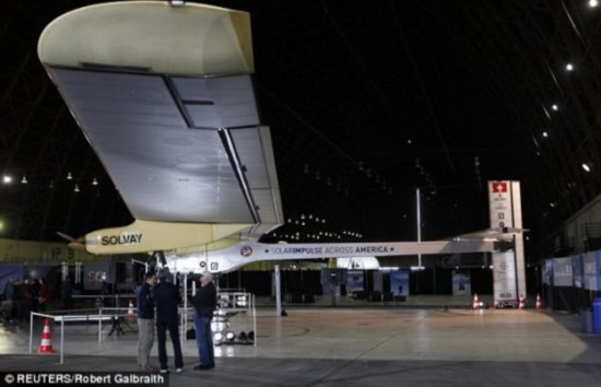 這個科研組希望到2015年乘坐這架太陽能飛機完成一次環球之旅。照片顯示,上周,陽光動力HB-SIA飛機在加利福尼亞州一個機庫中進行了展示。
