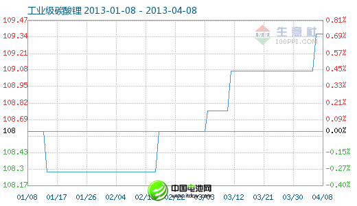 4月8日工業級碳酸鋰商品指數為109.37,與昨日持平,較周期內最高點112.10點(2012-11-04)下降了2.44%,較2012年01月05日最低點98.94點上漲了10.54%。(注:周期指2011-09-01至今) 工業級碳酸鋰商品指數