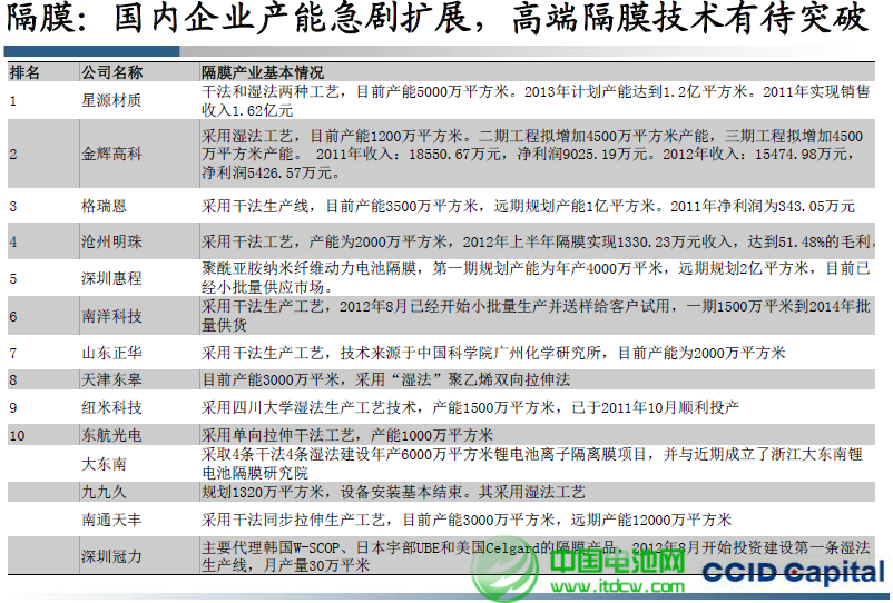但整體分析來看,中國國內隔膜企業產能急劇擴展,但高端隔膜技術有待突破。低水平重復建設嚴重。中國電池網-中國電池雜志認為,2013年鋰電池隔膜市場將面臨嚴酷的市場競爭,缺技術、少品牌、短資金者將被淘汰出局,尤其是中小企業境地不容樂觀。市場特征將呈現強者恒強、弱者出局的趨勢。