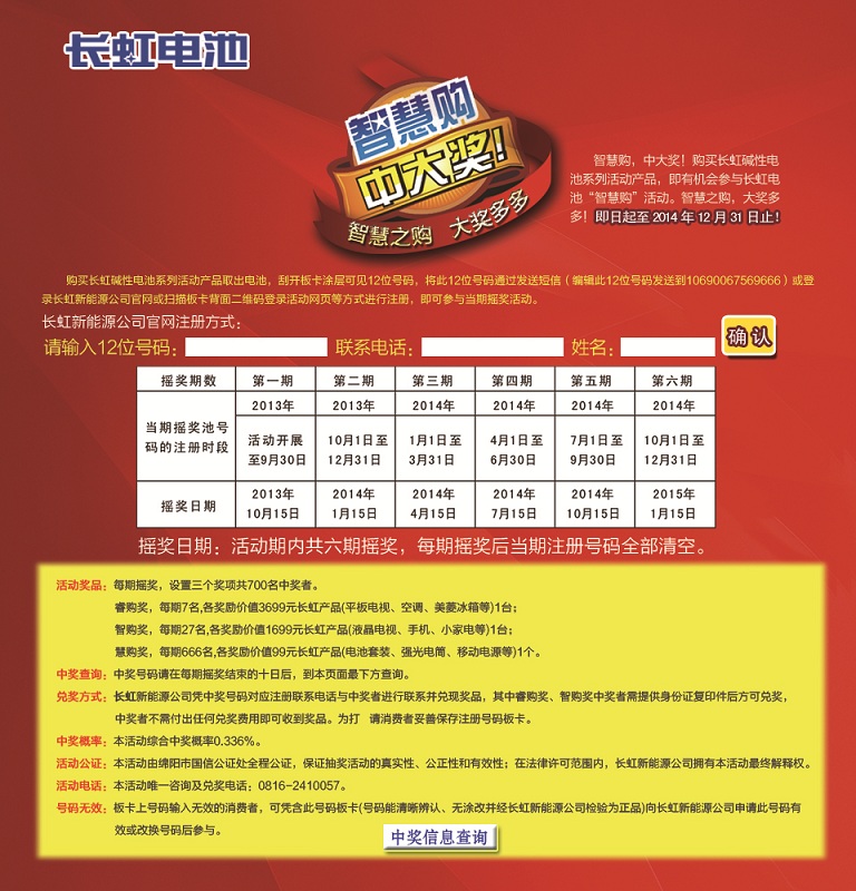 4月1日,長虹新能源公司面向消費者推出的高中獎率活動:長虹電池“智慧購”揚帆啟航了。本活動參與方式簡單,中獎?wù)卟恍枰冻鋈魏蝺丢勝M就可收到獎品,活動的結(jié)束時間為2014年12月31日