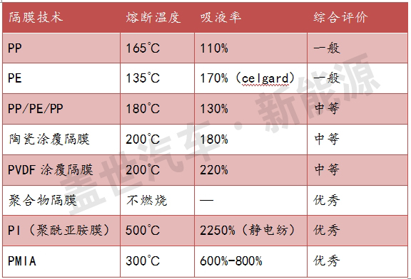 電池燃燒的過程中,隔膜因為高溫融化收縮導致電池內部短路是主要原因,提高隔膜的耐熱溫度是制造更安全電池的技術方向。隔膜并非一層紙那么簡單,除了溫度,隔膜的浸潤能力、孔隙率、機械強度、內阻、電化學穩定性等也是隔膜實際生產中考慮的因素。所以隔膜并非一層紙那么簡單,從耐溫安全和吸液率角度,綜合這幾個因素后,隔膜的技術方向如下。
