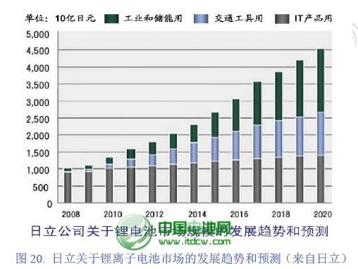 日立(Hitachi)認為,儲能市場將會與電動交通工具市場和3C電子產品市場一道,成為鋰離子電池3 大應用市場(見上圖)。中國電池網-中國電池雜志戰略合作機構——真鋰研究也持有相同觀點,只是對于各自的發展速度的預測稍有不同。