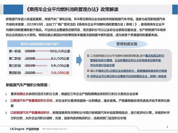 國家為規范新能源汽車市場有序發展,于2015年10月,出臺了廠商廣受關注的《乘用車企業平均燃料消耗管理辦法(草稿)》,使得乘用車企業平均燃料消耗管理將趨于落實。據相關預測僅2016年其不達標企業需繳罰款就可能達到近百億元,而至2020年,傳統整車企業解決的辦法或許只有向政府或新能源汽車企業購買積分唯一出路。