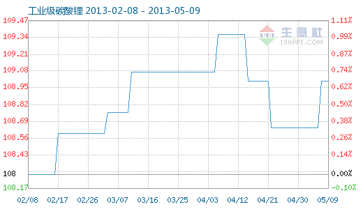 5月9日工業(yè)級碳酸鋰商品指數為109.01,與昨日持平,較周期內最高點112.10點(2012-11-04)下降了2.76%,較2012年01月05日最低點98.94點上漲了10.18%。