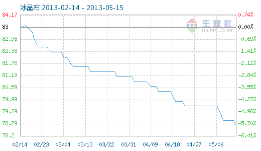 5月14日冰晶石商品指數(shù)為78.70,較昨日下降了0.25點(diǎn),創(chuàng)下周期內(nèi)的歷史新低,較2011年10月31日最高點(diǎn)101.21點(diǎn)下降了22.24%。 日期 02-14 02-23 03-04 03-13 03-22 03-31 04-09 04-18 04-27 05-06 05-14 商品指數(shù) 83.56 82.59 82.11 81.62 81.38 81.13 80.65 80.16 79.68 79.68 78.70