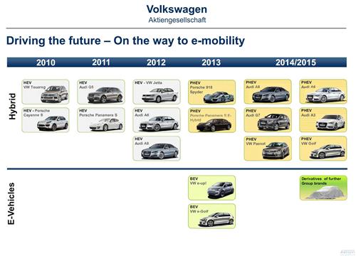 根據大眾汽車官方日前發布的文件,到2015年將推出10款以上電動車,其中大部分為插電式混合動力車(Plug-in Hybrid Electric Vehicle,PHEV)。