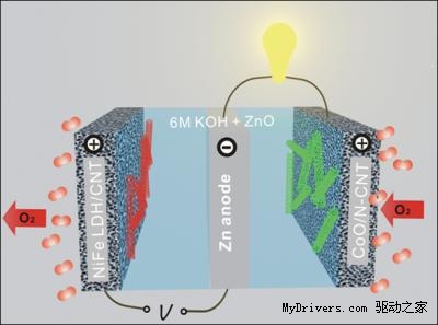 鋅空電池將普通氧氣和鋅金屬放在堿性電解液中,借助鋅的氧化反應(yīng)產(chǎn)生電流,而在重新充電后,氧氣和鋅又可以再生,如此往復(fù)循環(huán)。