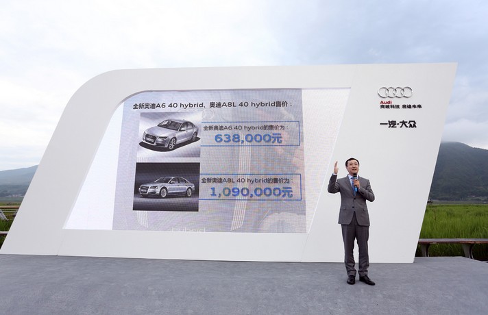 2013年5月29日,一汽-大眾奧迪在“China. Land of quattro?見地未來”大型活動的第一條線路——“綠色和諧之旅”的終點云南騰沖,舉辦“綠色科技 榮耀上市”活動,宣布全球最高效的全混C級豪華轎車——全新奧迪A6 40 hybrid和全混D級豪華轎車——全新奧迪A8L 40 hybrid正式上市,售價分別為63.8萬元和109萬元。這兩款混合動力的加入,使全新奧迪A6與全新奧迪A8產品形象更為豐滿,滿足勇于超越自我、崇尚綠色環保、注重生活品質、引領未來潮流的社會精英們的需求。
