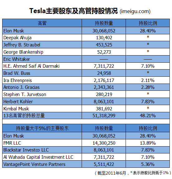 富國基金是Tesla的第二大股東,目前持有公司14,300,250股普通股,持股比例13.89%。著名風險投資基金公司VantagePoint Venture通過旗下多只基金共持有Tesla5.36%的股權。
