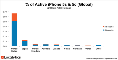 分析方法:“Localytics是全球領(lǐng)先的、專注于移動(dòng)和網(wǎng)絡(luò)應(yīng)用的分析營銷平臺(tái),覆蓋超過10億臺(tái)設(shè)備、20,000個(gè)應(yīng)用程序和5,000家客戶。Localytics每月處理500億數(shù)據(jù)點(diǎn)。對(duì)于這項(xiàng)研究,我們調(diào)查了全球2,000萬臺(tái)唯一iPhone手機(jī),并按國家進(jìn)行細(xì)分。研究時(shí)間段是從2013年9月20日iPhone 5S和iPhone 5C開售至本周一,即2013年9月23日。”