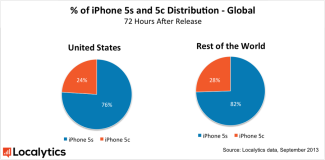 移動(dòng)應(yīng)用分析公司Localytics在新機(jī)發(fā)售后72小時(shí)后對(duì)2,000萬臺(tái)iPhone進(jìn)行了調(diào)查,調(diào)查發(fā)現(xiàn),全球范圍內(nèi)5S占新發(fā)售機(jī)型的78%,而在中國高達(dá)91%。